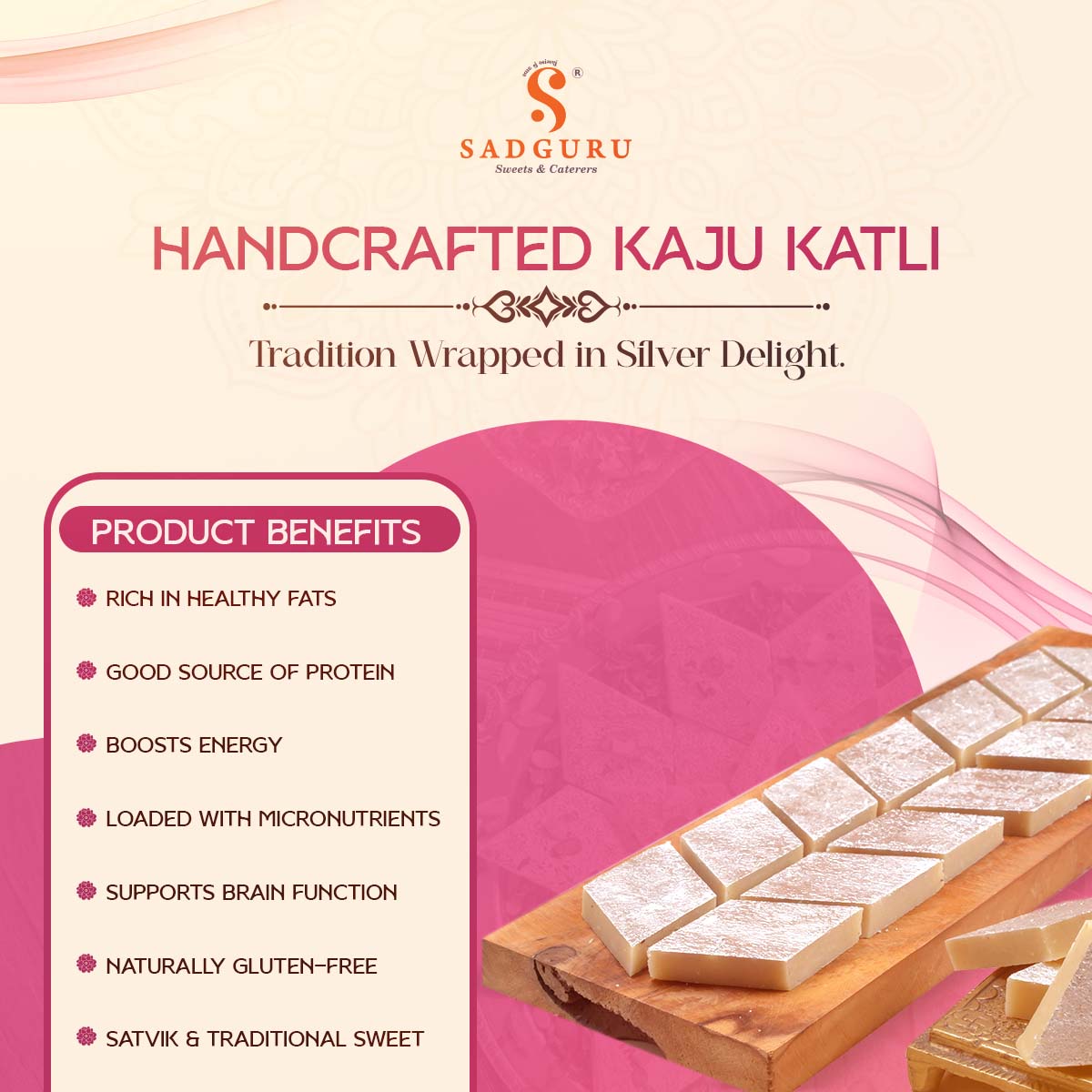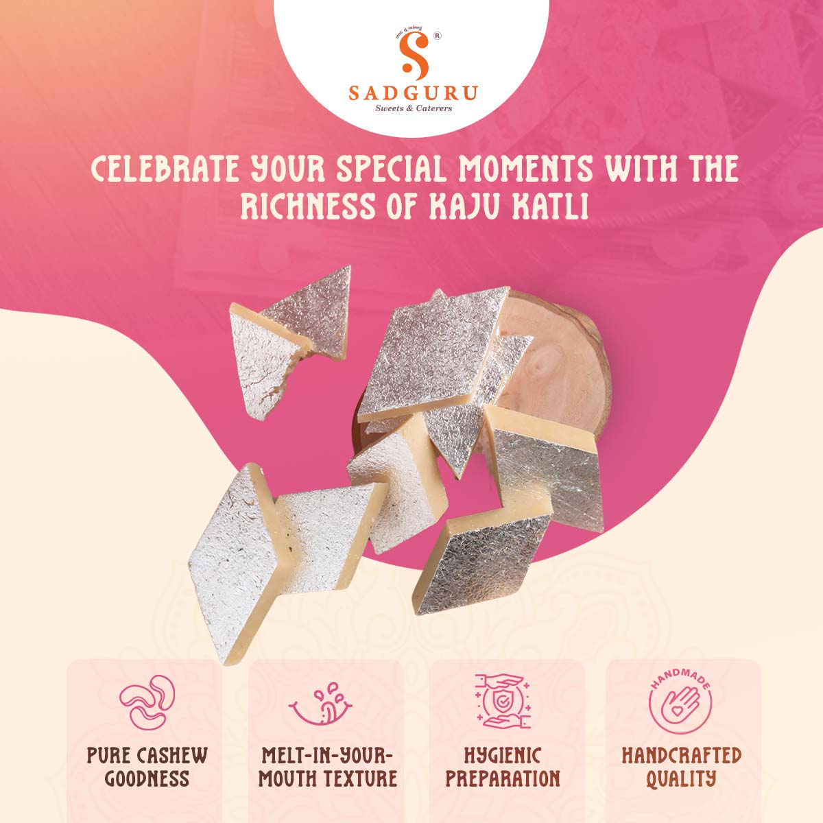 Sadguru’s Kaju Katli is a beloved Indian sweet crafted from 100% premium cashew nuts, gently ground into a smooth paste and cooked with care using natural ingredients. Free from preservatives, artificial colors, and excessive sweetness, our Kaju Katli offers the perfect balance of rich taste and traditional texture.
